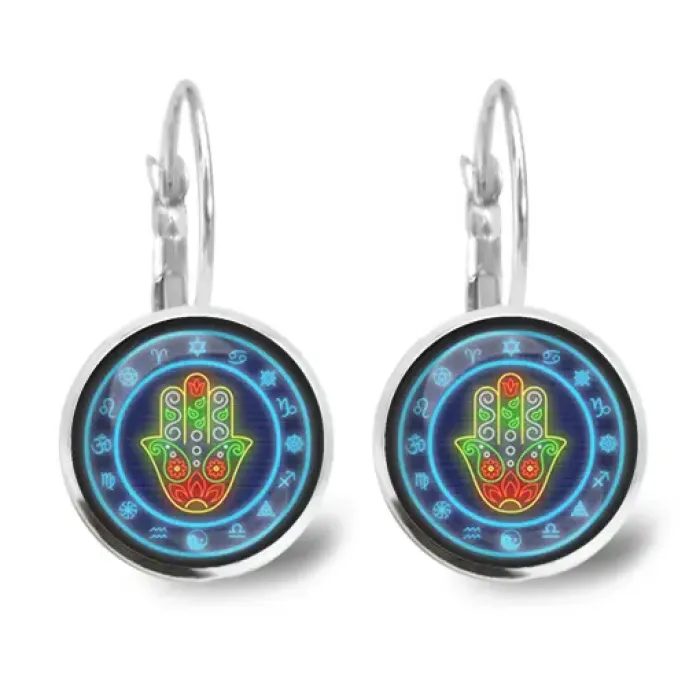 Серьги-сувенир с изображением Хамсы. Изготовлены из бижутерного сплава, имеют выпуклые стеклянные линзы и замок типа левербэк.