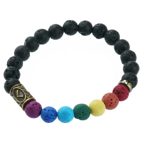 Стрейч-браслет из натурального камня лава с латунной подвеской в виде руны Кеназ и бусинами, символизирующими семь чакр.