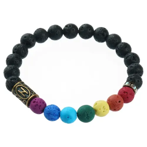 Стрейч-браслет с бусинами из натурального камня лава и латунной подвеской в виде руны Хагалаз.