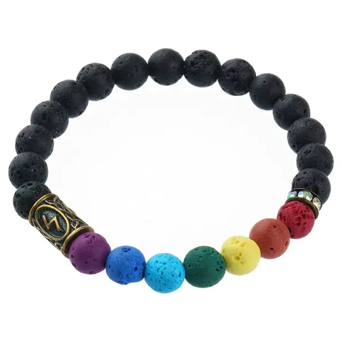 Стрейч-браслет с бусинами из натурального камня лава и латунной руной Соулу.