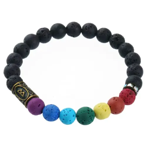 Стрейч-браслет с бусинами из натурального камня лава и подвеской в виде скандинавской руны Беркана.