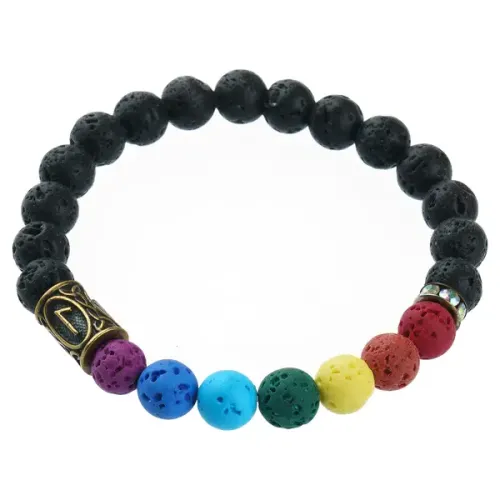 Стретч-браслет для аромабижутерии из натурального камня лава с латунной руной Лагуз и символикой семи чакр.