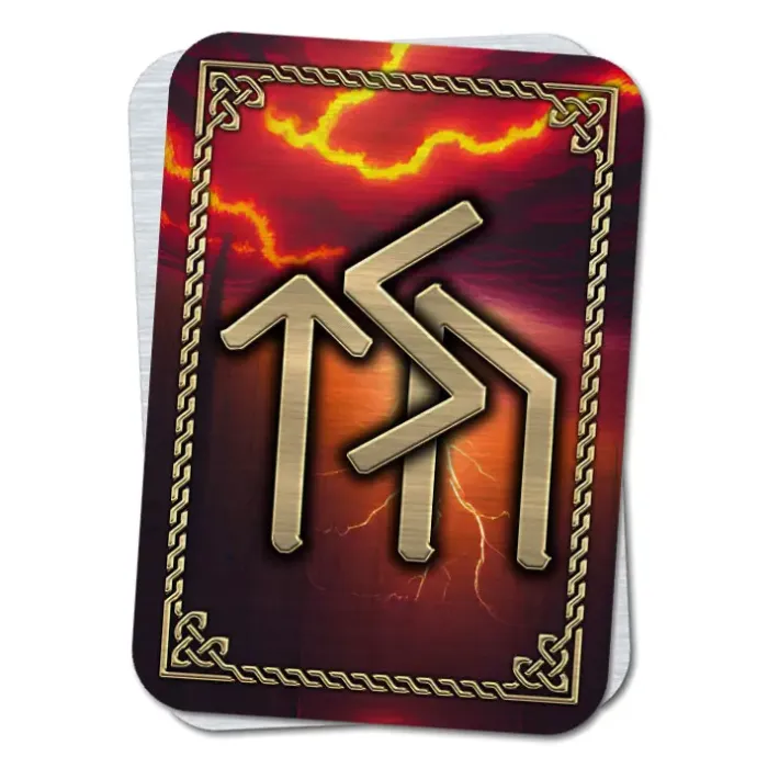 Магнит-амулет с рунической формулой «Сила, энергия, достижение цели». Изготовлен из металла.
