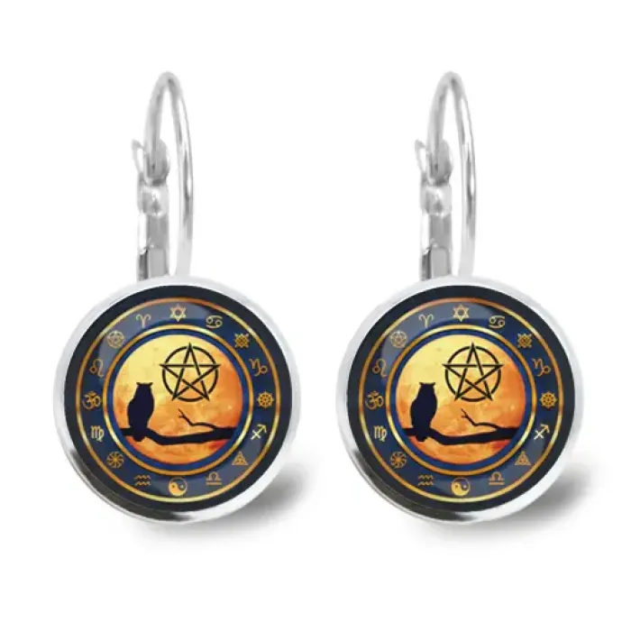 Серьги для пирсинга уха с символикой совы и пентаграммы. Изготовлены из бижутерного сплава с покрытием под серебро, имеют выпуклые стеклянные линзы.