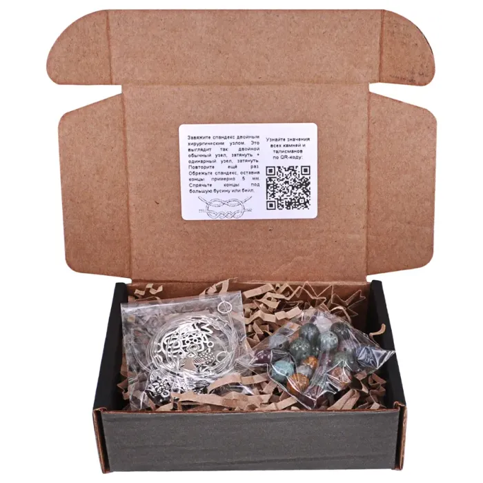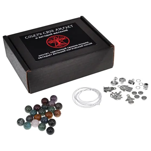 Набор для создания браслета своими руками, который не только позволит проявить творческий подход, но и станет символом защиты и гармонии. В состав входят 23 бусины из натуральной яшмы диаметром 8 мм, каждая из которых обладает уникальными свойствами. Дополняют набор 5 подвесок из бижутерного сплава с символами: Лотос (спокойствие), Сундук (богатство), Хамса (защита), Черепаха (здоровье) и Шляпа ведьмы (красота). Также в комплект входят 3 бейла, 3 колечка из стали и спандекс длиной около 1 метра. Коробка имеет размеры 10х7,5х2,5 см.