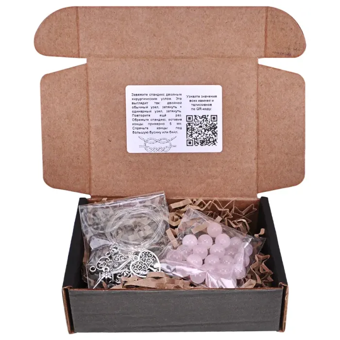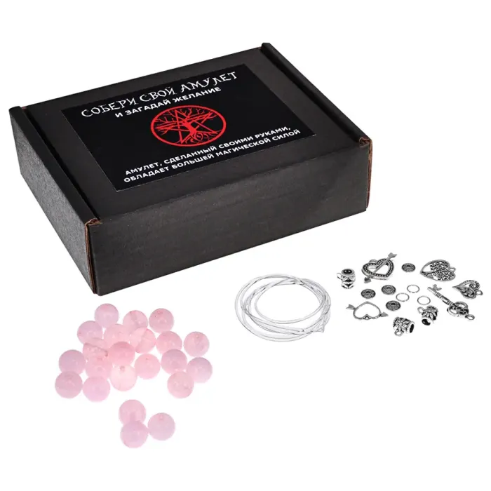 Набор для создания браслета своими руками, который станет прекрасным символом любви и гармонии. Розовый кварц, входящий в состав, считается камнем-талисманом влюблённых, усиливающим притягательность и помогающим обрести согласие с партнёром. В наборе: 23 бусины из натурального розового кварца (диаметр 8 мм), 5 подвесок из бижутерного сплава, 3 бейла и 4 разделителя из того же материала, а также 3 колечка из стали и спандекс длиной около 1 метра. Коробка имеет размеры 10х7,5х2,5 см. Комплект включает все необходимые элементы для самостоятельной сборки: бусины, фурнитуру и краткую инструкцию по завязыванию спандекса хирургическим узлом. Также предоставляется QR-ссылка на описание значений всех камней и талисманов.