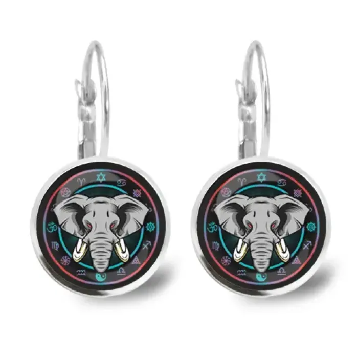 Серьги с изображением слона под выпуклой стеклянной линзой. Изготовлены из бижутерного сплава.