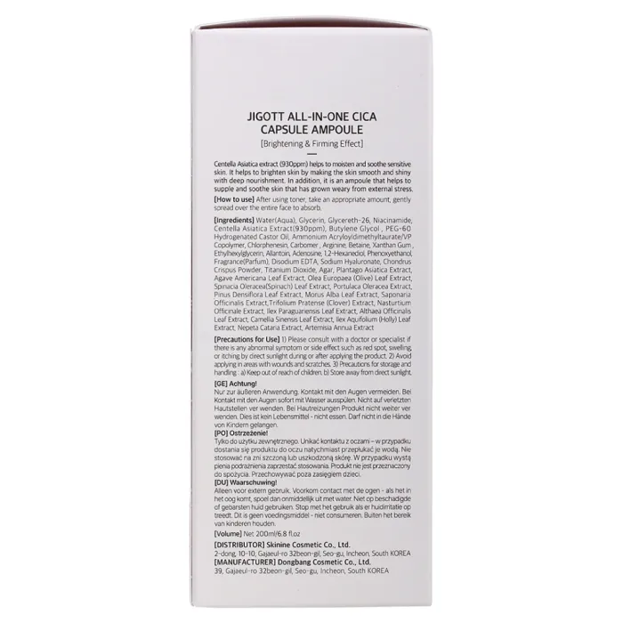 Сыворотка Jigott All-In-One Cica Capsule Ampoule с экстрактом центеллы азиатской предназначена для комплексного ухода за кожей. Она обеспечивает увлажняющее и успокаивающее действие, эффективно снимает шелушения и способствует заживлению акне. Средство предупреждает появление новых высыпаний, благодаря мощным целебным и омолаживающим свойствам экстракта центеллы азиатской.