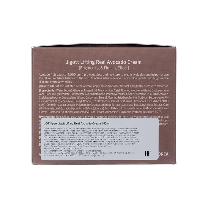 Крем-лифтинг для лица с авокадо Jigott Lifting Real Avocado Cream объемом 150 мл — это эффективное средство для ухода за кожей, созданное на основе масла авокадо. Продукт обеспечивает интенсивное увлажнение, смягчение и устранение шелушений. Благодаря активным компонентам крем улучшает тон кожи и способствует разглаживанию морщин.