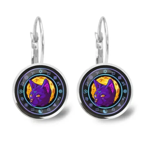 Серьги с изображением лунного кота под выпуклой стеклянной линзой.