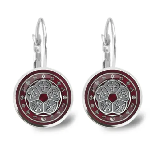 Серьги с изображениями под выпуклыми стеклянными линзами. Тип замка — левербэк.