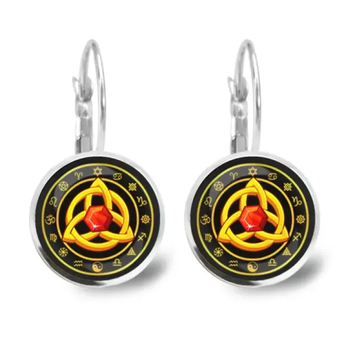Серьги с символом трикветра. Изготовлены из бижутерного сплава со стеклянными линзами и замком типа левербэк.
