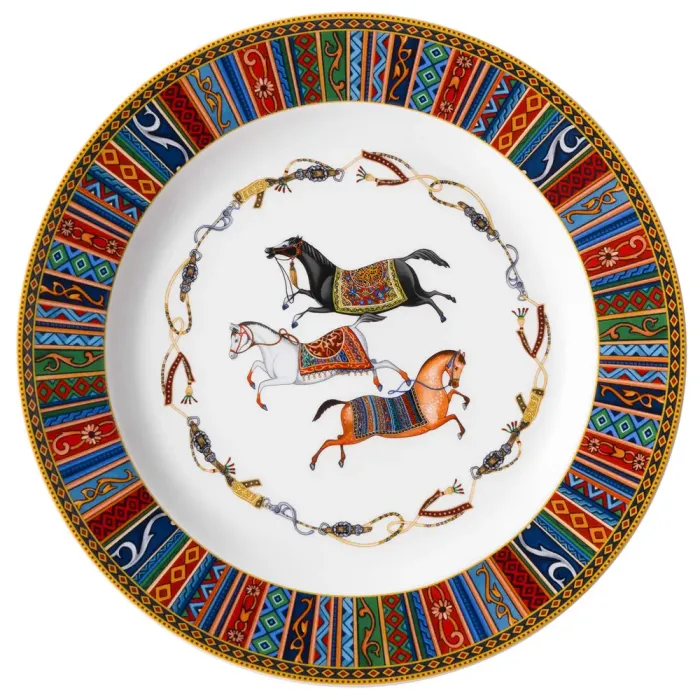 Тарелки изготовлены из тонкостенного упрочненного фарфора, что обеспечивает прочность и гигиеничность. Прямые формы тарелок соответствуют современному стилю коллекции, дизайн которой вдохновлен движениями лошадей и включает богатый орнамент.