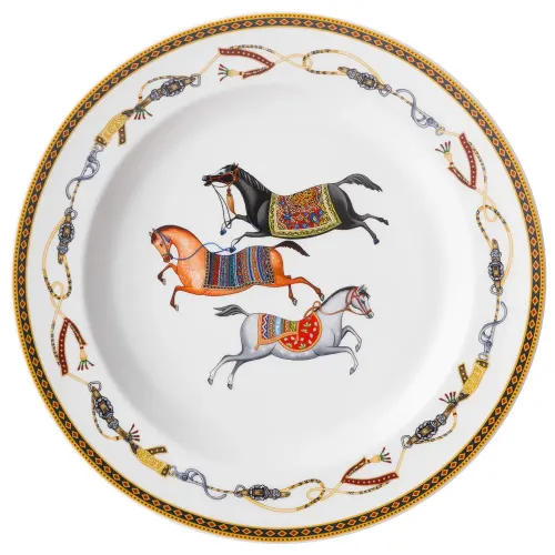 Тарелки выполнены из тонкостенного упрочненного фарфора, что повышает их механическую прочность. Поверхность украшена декоративным орнаментом, вдохновленным движениями лошадей. Дизайн нанесен с применением технологии деколирования и закреплен высокотемпературным обжигом.