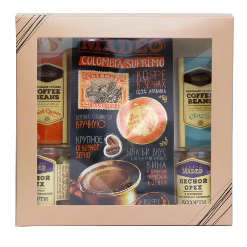 Подарочный набор включает плантационный зерновой кофе из Колумбии средней обжарки. Вкус сбалансированный, с низкой кислотностью, плотным телом и умеренной горчинкой, раскрывается нотами красного вина и тёмных ягод.