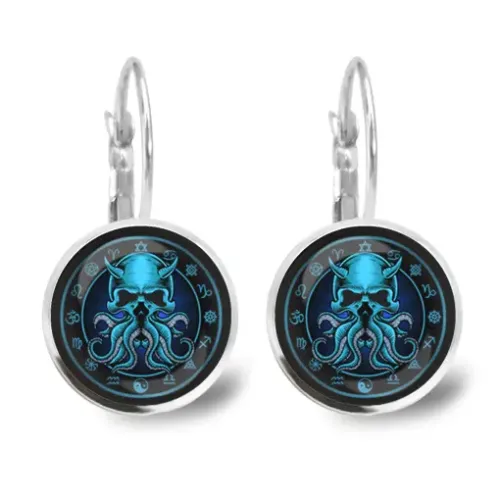 Серьги с изображением Ктулху диаметром 18 мм под выпуклой стеклянной линзой.