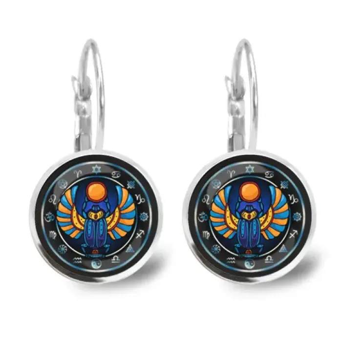 Серьги с изображением скарабея. Изготовлены из бижутерного сплава со стеклянными вставками.