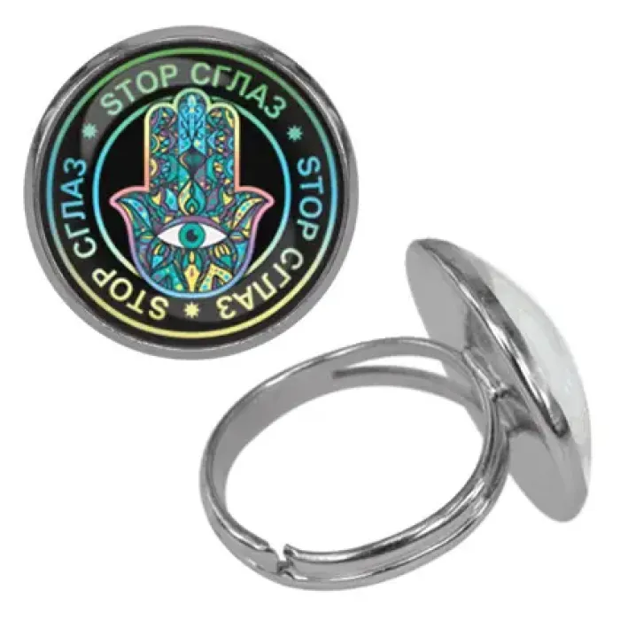Безразмерное кольцо с изображением, символизирующим защиту от негативной энергии. Это украшение обладает диаметром 18 мм и подчеркивает уникальный стиль благодаря выпуклой стеклянной линзе. Изготовлено из бижутерного сплава с покрытием под серебро, что делает его не только красивым, но и долговечным. Упаковано в прозрачный пакет для удобства хранения и подарков. Традиционно такие кольца ценятся за свою способность оберегать владельца от сглаза и недоброжелательных взглядов.