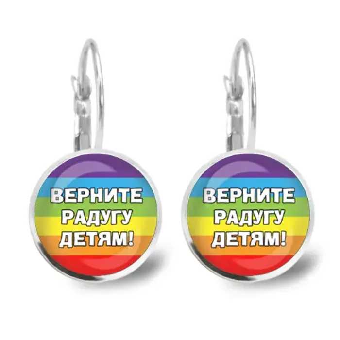 Серьги «Верните радугу детям» — бижутерный аксессуар с изображениями под выпуклыми стеклянными линзами.