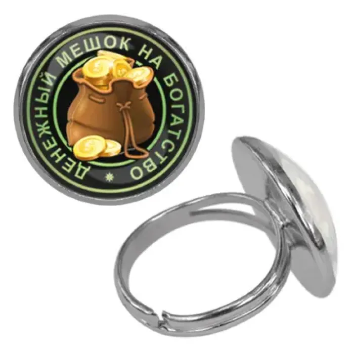 Безразмерное кольцо для ношения как сувенирный или интерьерный декор. Изготовлено из бижутерного сплава с изображением денежного мешка под выпуклой стеклянной линзой.