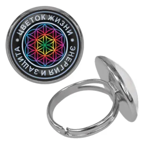 Безразмерное кольцо с изображением символа «Цветок жизни» под выпуклой стеклянной линзой.