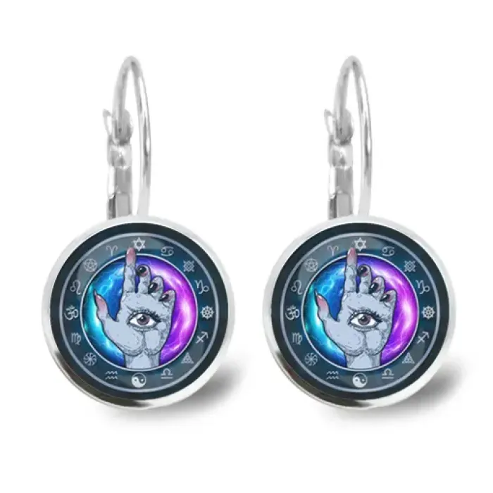 Серьги для пирсинга уха. Бижутерный сплав, дизайн с изображением руки и глаза под выпуклым стеклом, замок типа левербэк.