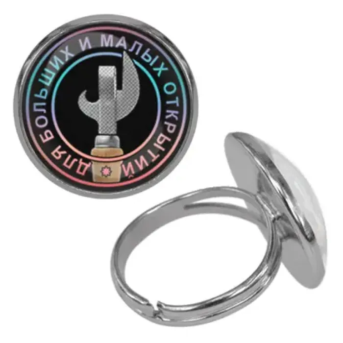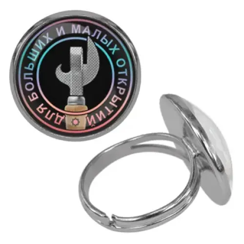 Безразмерное кольцо для сувенира или личного аксессуара. Изготовлено из бижутерного сплава с покрытием под серебро, имеет круглый медальон диаметром 18 мм под выпуклой стеклянной линзой.