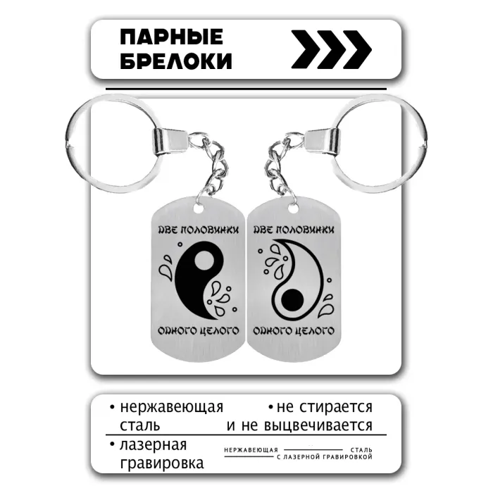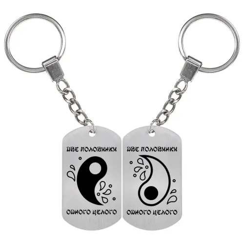 Парные брелоки-жетоны из нержавеющей стали — это стильный и символичный аксессуар, который подчеркивает близость и единство. Изображение на брелоках нанесено методом лазерной гравировки, что обеспечивает долговечность и четкость рисунка. Размер жетона составляет 50х28 мм, что делает его удобным для использования. Каждый комплект включает кольцо для ключей на цепочке, а упаковка в прозрачный пакет добавляет элегантности. Эти брелоки идеально подходят для подарка любимым или друзьям, олицетворяя важные моменты совместной жизни.