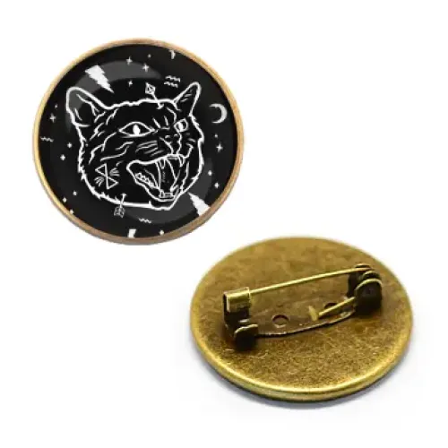 Значок с изображением чёрного кота под выпуклой стеклянной линзой — это стильный аксессуар, который станет отличным дополнением к любому наряду или подарком для любителей кошек. Он выполнен в бронзовом цвете и имеет диаметр 27 мм, что делает его компактным и удобным для ношения.