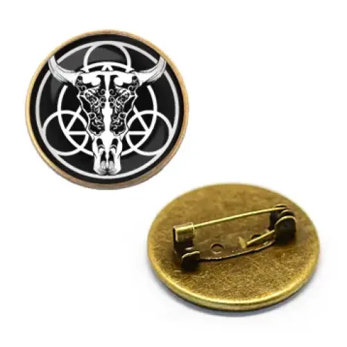 Значок Рогатый череп — это стильный аксессуар с уникальным дизайном, который станет ярким дополнением к любому образу. Изображение под выпуклой стеклянной линзой придаёт значку особую выразительность и глубину, а бронзовый цвет добавляет нотку элегантности. Компактный размер (d. 27 мм) позволяет носить его как на одежде, так и на аксессуарах. Упаковка в полипропиленовый пакетик обеспечивает защиту от повреждений и удобно подходит для хранения или подарка.