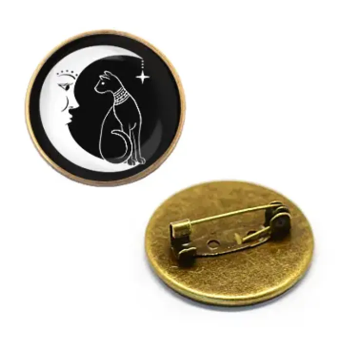 Значок "Кот на месяце" — это оригинальный аксессуар, который станет прекрасным дополнением к любому наряду или подарком для любителей кошек и астрономии. Изображение под выпуклой стеклянной линзой придаёт значку особую выразительность и глубину.