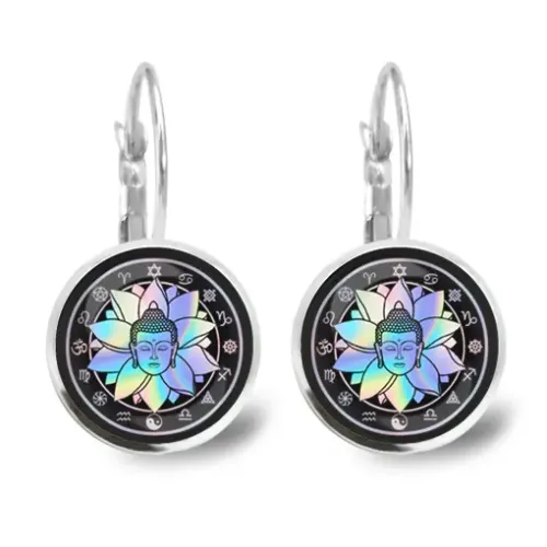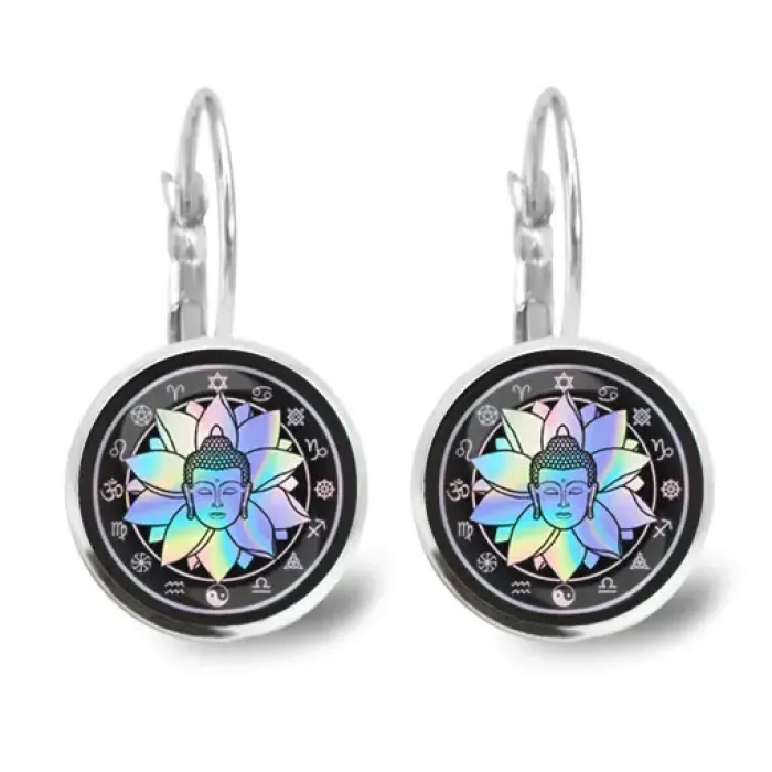 Серьги с изображением Будды из бижутерного сплава с покрытием под серебро и выпуклыми стеклянными линзами.