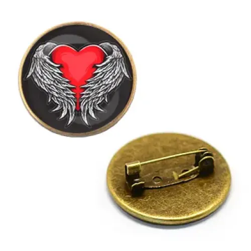 Значок «Сердце ангела» — это изящный аксессуар с изображением, защищённым выпуклой стеклянной линзой. Он символизирует любовь и защиту, что делает его идеальным подарком для близких и друзей. Размер значка составляет 27 мм в диаметре, а бронзовый цвет придаёт ему особую элегантность.