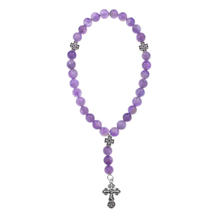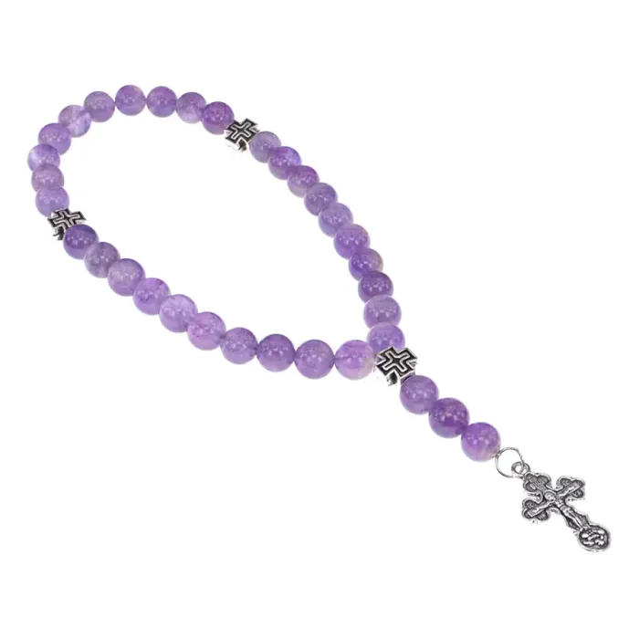 Чётки ручной работы с бусинами из натурального аметиста. Дизайн включает коннектор в форме креста.