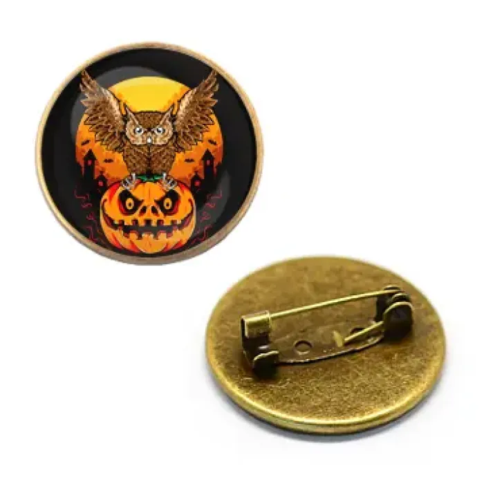 Значок Сова на тыкве — стильный аксессуар с уникальным дизайном, который станет замечательным дополнением к любому образу. Изображение совы под выпуклой стеклянной линзой придаёт изделию особую выразительность и глубину. Размер значка составляет 27 мм в диаметре, а бронзовый цвет добавляет ему изысканности и шарма.