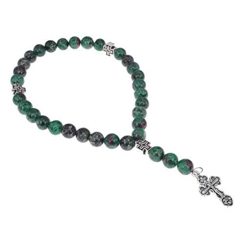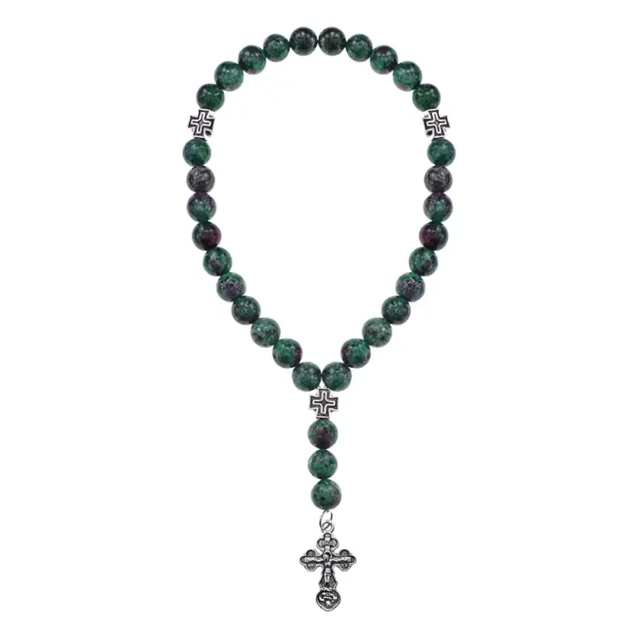 Чётки ручной работы с бусинами из синтетического циозита символизируют семью, любовь и тепло. Их высота составляет примерно 17,5 см, а диаметр бусин — 8 мм. Большой коннектор в форме креста имеет размеры 25х15 мм, в то время как три малых коннектора имеют размер 7,5х7,5 мм. Цоизит ценится за свою способность приносить уют и покой в жизнь. Традиционно используется для медитации и духовных практик.