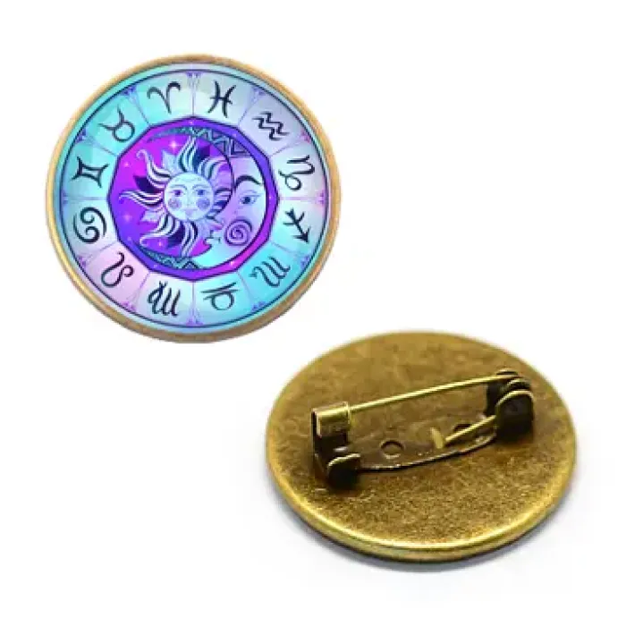 Значок с изображением астрологических символов под выпуклой стеклянной линзой — это не только стильный аксессуар, но и элемент, который может стать интересным подарком или сувениром. Он выполнен в бронзовом цвете и имеет диаметр 27 мм.