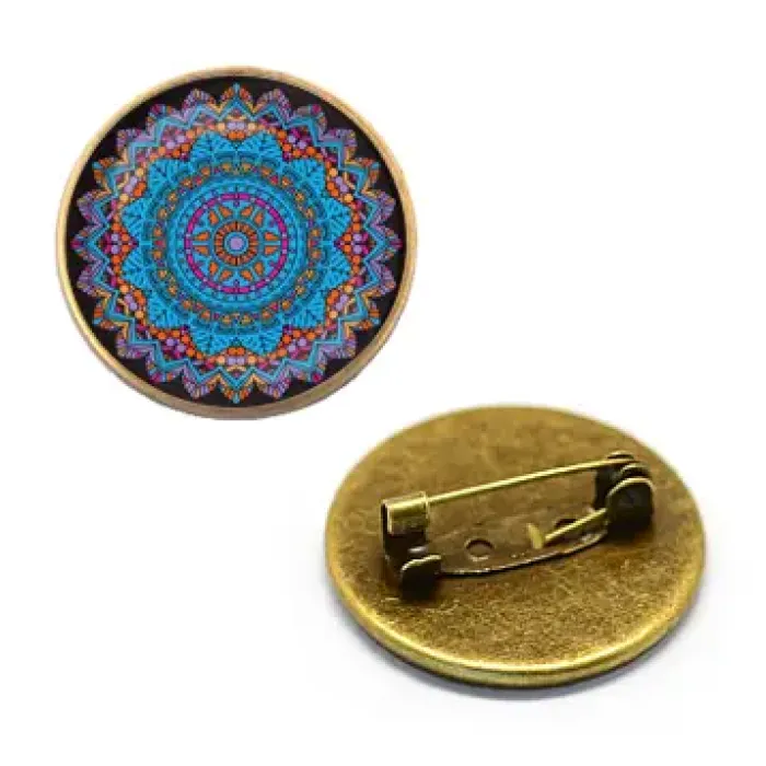 Значок с изображением мандалы под выпуклой стеклянной линзой — это не просто аксессуар, а символ гармонии и миропорядка. Мандала представляет собой сложную геометрическую фигуру, которая в культуре многих народов олицетворяет модель мира божеств и духовное равновесие.