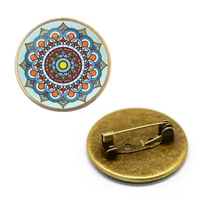 Значок с изображением мандалы под выпуклой стеклянной линзой — это не просто аксессуар, а символ гармонии и миропорядка. Мандала представляет собой сложную геометрическую фигуру, которая традиционно используется в различных культурах как модель мира божеств.