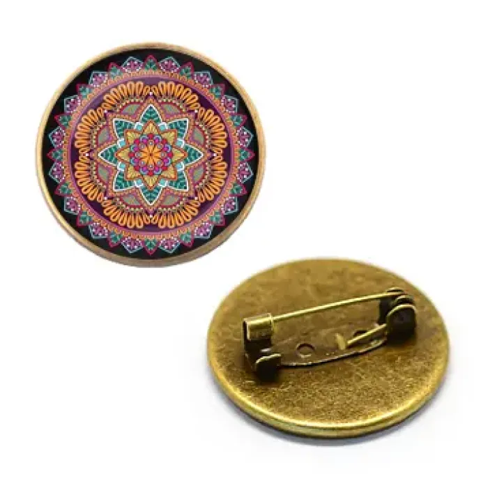 Значок с изображением мандалы под выпуклой стеклянной линзой — это не просто аксессуар, а символ гармонии и миропорядка. Мандала представляет собой сложную геометрическую фигуру, имеющую сакральное значение в различных культурах и традициях. Этот значок станет прекрасным дополнением к любому образу или оригинальным подарком для ценителей искусства.