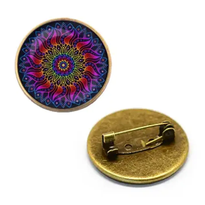 Значок с изображением мандалы под выпуклой стеклянной линзой — это не просто аксессуар, а символ гармонии и миропорядка. Мандала представляет собой сложную геометрическую фигуру, которая в восточных культурах ассоциируется с божественным порядком и внутренним спокойствием.