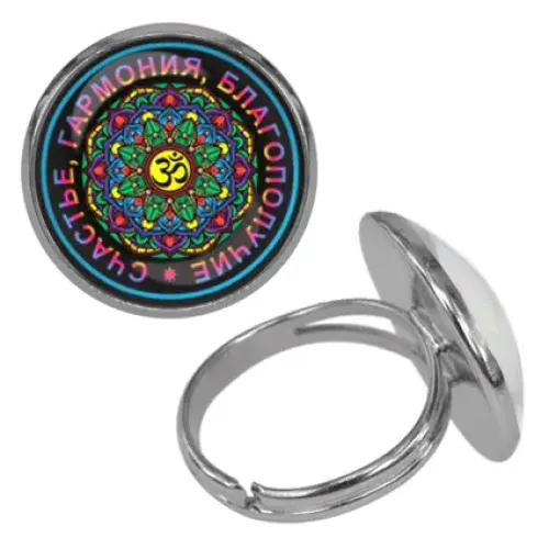 Безразмерное кольцо с изображением мандалы Ом. Изготовлено из бижутерного сплава с покрытием под серебро и выпуклой стеклянной линзой.