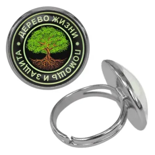 Безразмерное кольцо с символом Дерева жизни. Изготовлено из бижутерного сплава с покрытием под серебро, изображение защищено выпуклой стеклянной линзой.