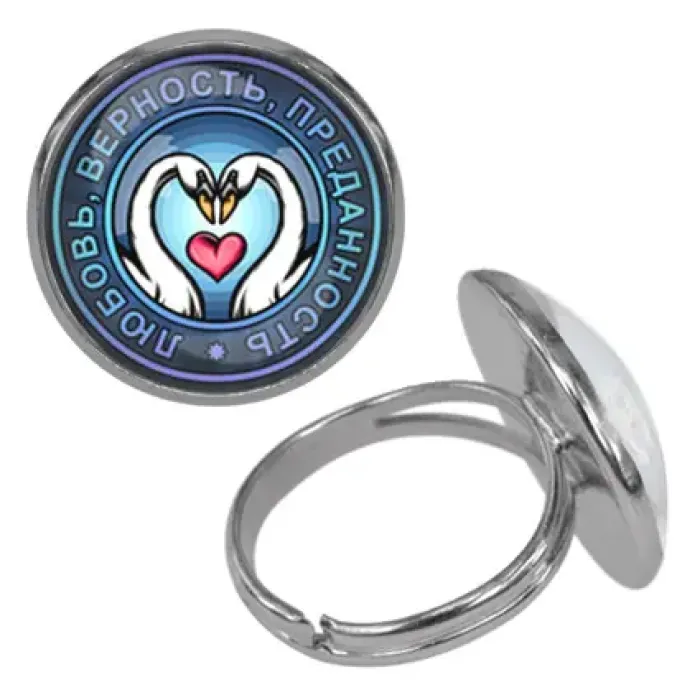 Безразмерное кольцо с изысканным изображением двух лебедей, символизирующих любовь и верность. Диаметр кольца составляет 18 мм, что делает его универсальным аксессуаром для любого пальца. Изготовлено из бижутерного сплава с покрытием под серебро и дополнено выпуклой стеклянной линзой, придающей ему особый блеск. Упаковано в прозрачный пакет, что делает его отличным вариантом для подарка или личного использования. Это украшение станет стильным акцентом в любом образе.