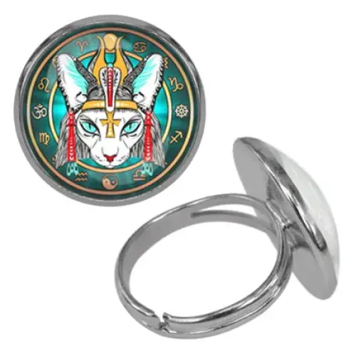Безразмерное кольцо с изображением египетской кошки под выпуклой стеклянной линзой.