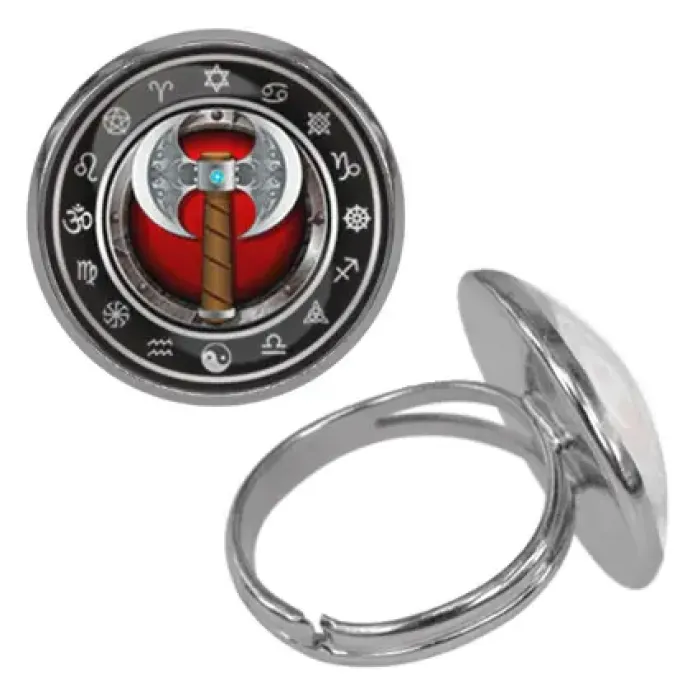 Безразмерное кольцо с изображением секиры под выпуклой стеклянной линзой.
