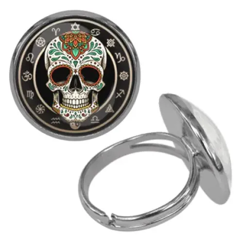 Безразмерное кольцо с изображением черепа под выпуклой стеклянной линзой.