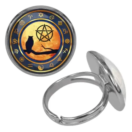 Безразмерное кольцо с изображением совы и пентаграммы. Аксессуар из бижутерного сплава со стеклянной вставкой.