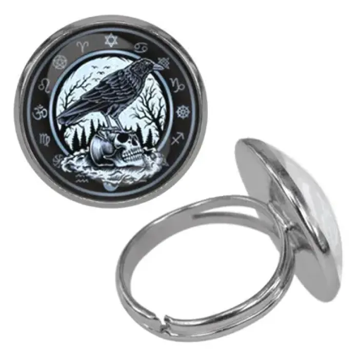Безразмерное кольцо из бижутерного сплава с дизайном в виде ворона на черепе.