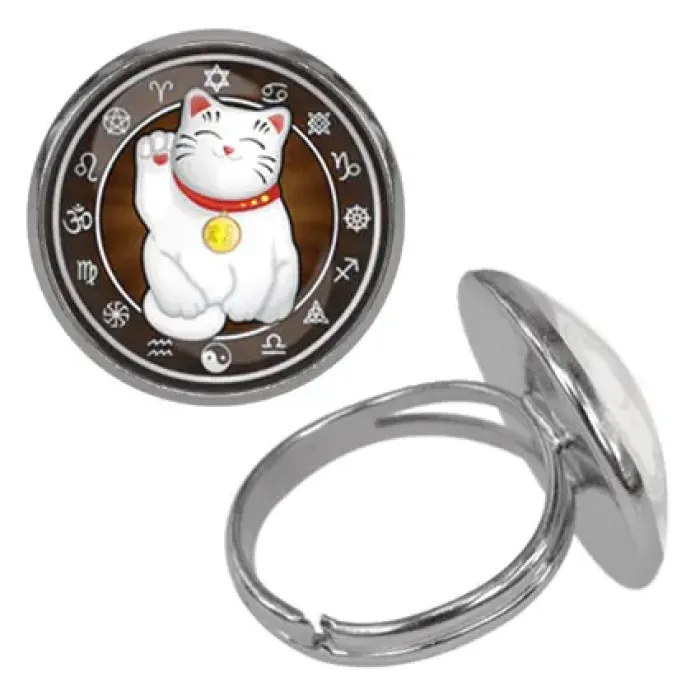 Безразмерное кольцо с изображением манеки-неко. Изделие выполнено из бижутерного сплава и стекла, дизайн дополнен выпуклой стеклянной линзой.